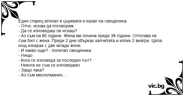 - Аз съм на 86 години. Жена ми почина преди 38 години. Оттогава не съм бил с жена. Преди 2 дни обърках хапчетата и изпих 2 виагри. Цяла нощ изкарах с две млади жени.