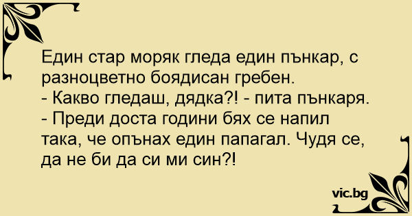Egy öregember üldögél egy padon. Odaül mellé egy punk csávó a szivárvány színeiben játszó tarajos hajával. Az öreg csak bámul rá. Végül a punk nem bírja tovább és megkérdezi: - Mi van tata, még...