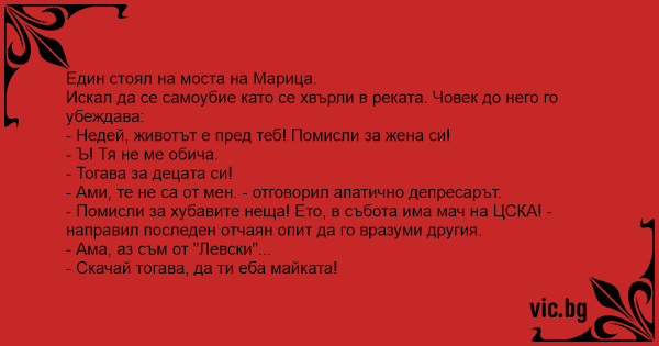 - Помисли за хубавите неща! Ето, в събота има мач на ЦСКА! - направил последен отчаян опит да го вразуми другия.