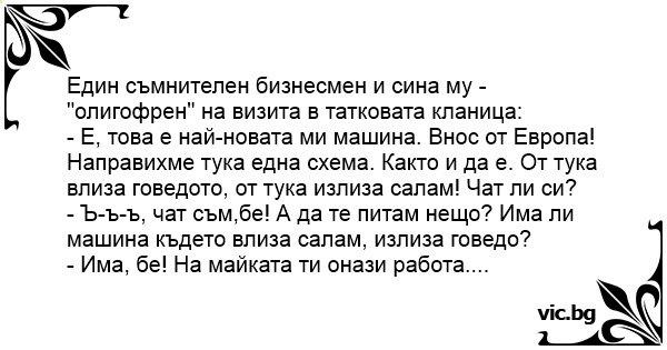 - папа, а ест такой мащин, туда баран заходыт, а колбаса выходыт? -... Синът на един борец бил адски тъп. Собственик на фабрика за производство на колбаси имал доста глупав син. Като поотраснало момчето, бащата решил да го запознае с производството: Владелец мясокомбината привел великовозрастного сына на производство-годы идут, старость не за горами, дела надо кому-то передавать и т.д и т.п Ένας εργοστασιάρχης έχει έναν χαζό γιο. Μια μέρα λοιπόν τον πάει να του δείξει το εργοστάσιο αλλαντικών που έχουν. Приводит папа Вовочку на экскурсию на колбасную фабрику. Um empresário português bilionário, inventor de uma máquina totalmente automática na qual se colocava um burro vivo por uma abertura e no final do processo saiam caixas de linguiça prontas para serem vendidas, resolveu mostrar a fabrica por herdeiro. Depois de mostrar todo o funcionamento do... Jasiu przychodzi podekscytowany do domu i opowiada: - Dziś byliśmy z klasą w takiej fabryce, gdzie była maszyna, do której wrzucali barana a wychodziły parówki. Tato, a czy jest taka maszyna, do której wkłada sie parówkę a wychodzi baran? - Tak, synku, Twoja matka.