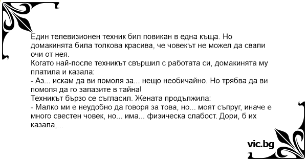 - Малко ми е неудобно да говоря за това, но... моят съпруг, иначе е много свестен човек, но... има... физическа слабост. Дори, б их казала, че не може да се справя с някои неща. Исках да ви помоля за това още от мига, в който ви видях на врата. Аз съм жена, а вие сте мъж и си помислих, че бихте могъл...