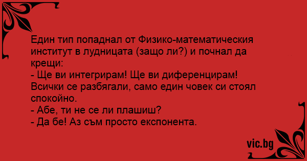Един тип попаднал oт Физико-математическия институт в лудницата (защо ли?) и почнал да крещи: