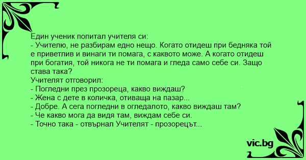 - Учителю, не разбирам едно нещо. Когато отидеш при бедняка той е приветлив и винаги ти помага, с каквото може. А когато отидеш при богатия, той никога не ти помага и гледа само себе си. Защо става така?
