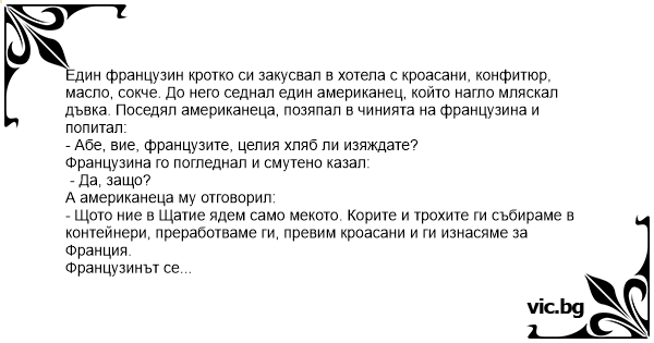 Французинът се намръщил, но продължил кротко да си хапва докато янкито, продължавайки нагло да мляска с дъвката, не се намесил отново: