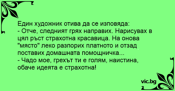 - Отче, следният грях направих. Нарисувах в цял ръст страхотна красавица. На онова "място" леко разпорих платното и отзад поставих домашната помощничка...