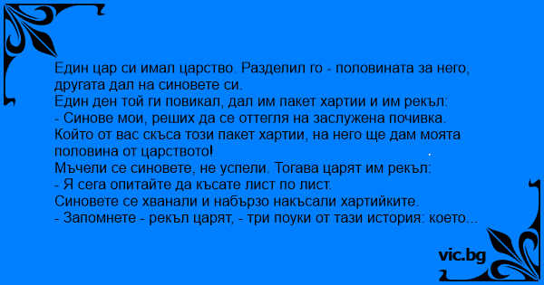- Синове мои, реших да се оттегля на заслужена почивка. Който от вас скъса този пакет хартии, на него ще дам моята половина от царството!