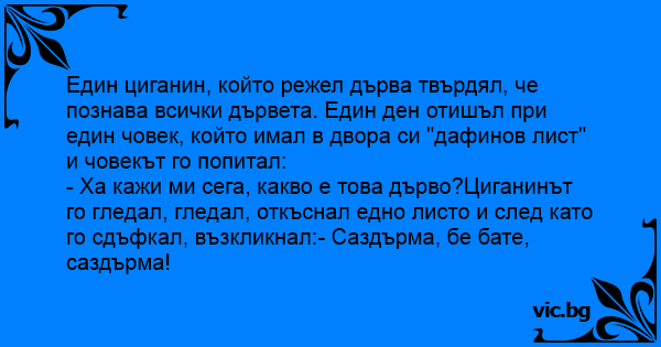 - Ха кажи ми сега, какво е това дърво?Циганинът го гледал, гледал, откъснал едно листо и след като го сдъфкал, възкликнал:- Саздърма, бе бате, саздърма!