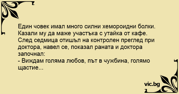 Един човек имал много силни хемороидни болки. Казали му да маже участъка с утайка от кафе.