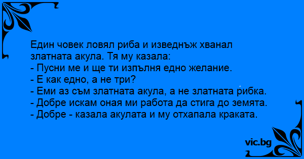 Един човек ловял риба и изведнъж хванал златната акула. Тя му казала: