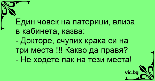 - Докторе, счупих крака си на три места !!! Какво да правя?