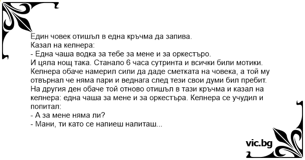 И цяла нощ така. Станало 6 часа сутринта и всички били мотики. Келнера обаче намерил сили да даде сметката на човека, а той му отвърнал че няма пари и веднага след тези свои думи бил пребит. На другия ден обаче той отново отишъл в тази кръчма и казал на келнера: една чаша за мене и за оркестъра. Келнера се учудил и попитал: