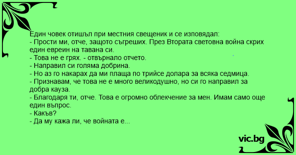 - Прости ми, отче, защото съгреших. През Втората световна война скрих един евреин на тавана си.