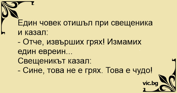 Пришёл мужик к священнику и говорит: - Я грех совершил. Обманул еврея... . Батюшка отвечает: - Это - не грех. Это - чудо!
