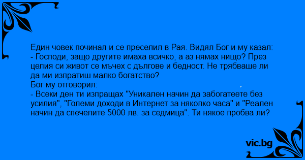 Един човек починал и се преселил в Рая. Видял Бог и му казал: