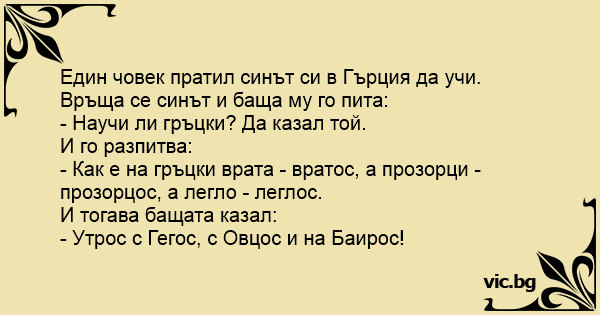 Един човек пратил синът си в Гърция да учи. Връща се синът и баща му го пита: