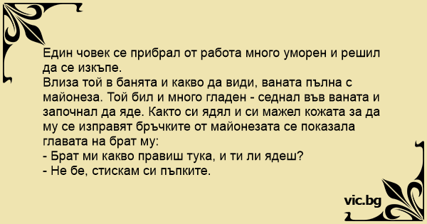 Влиза той в банята и какво да види, ваната пълна с майонеза. Той бил и много гладен - седнал във ваната и започнал да яде. Както си ядял и си мажел кожата за да му се изправят бръчките от майонезата се показала главата на брат му: