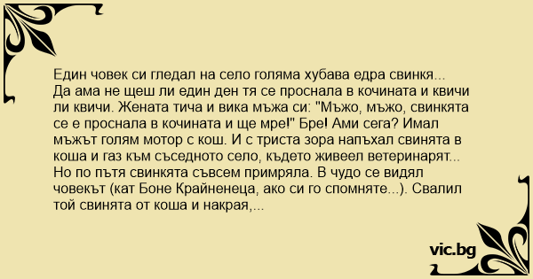 Да ама не щеш ли един ден тя се проснала в кочината и квичи ли квичи. Жената тича и вика мъжа си: "Мъжо, мъжо, свинкята се е проснала в кочината и ще мре!" Бре! Ами сега? Имал мъжът голям мотор с кош. И с триста зора напъхал свинята в коша и газ към съседното село, където живеел ветеринарят... Но по пътя свинкята съвсем примряла. В чудо се видял човекът (кат Боне Крайненеца, ако си го спомняте...). Свалил той свинята от коша и накрая, от чисто отчаяние, взел, че я...УВАЖИЛ. Брех, мамка му и свиня - оправила се веднага след приключението, даже и до ветеринаря не стигнали... На другата седмица историята се повторила 100%. На третата седмица жената тича при мъжа си: "Мъжо, мъжо, връщай се бързо в къщи, че свинята сложила каската и те чака в коша на мотора да ходите при ветеринаря!"
