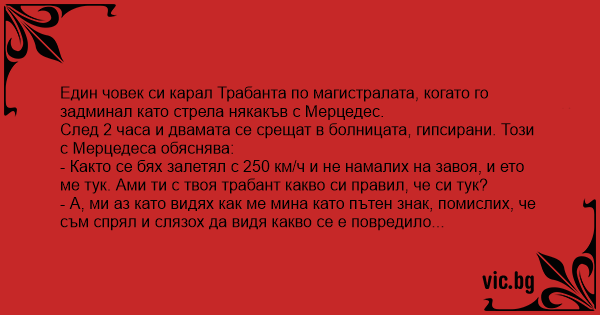 След 2 часа и двамата се срещат в болницата, гипсирани. Този с Мерцедеса обяснява: