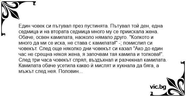Един човек си пътувал през пустинята. Пътувал той ден, една седмица и на втората седмица много му се приискала жена. Обаче, освен камилата, наоколо нямало друго. "Колкото и много да ми се иска, не става с камилата!" -; помислил си човекът. След още няколко дни човекът си казал "Ако до един час не срещна някоя жена, я започвам тая камила и толкова!". След три часа човекът спрял, въздъхнал и разчекнал камилата. Камилата обаче усетила какво ѝ мислят и хукнала да бяга, а мъжът след нея. Половин час по-късно, тичайки, човекът налита на страхотна мацка, която изкусително го попитала: