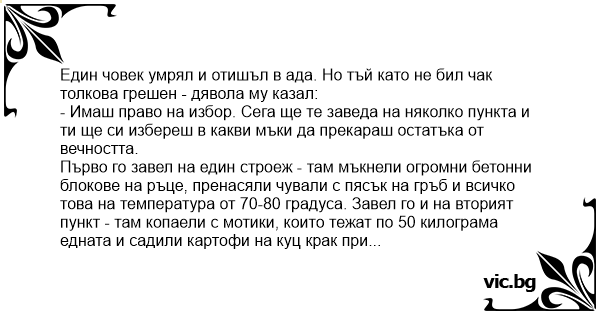Първо го завел на един строеж - там мъкнели огромни бетонни блокове на ръце, пренасяли чували с пясък на гръб и всичко това на температура от 70-80 градуса. Завел го и на вторият пункт - там копаели с мотики, които тежат по 50 килограма едната и садили картофи на куц крак при същата температура. Отишли и на последният обект - там било сравнително по-хладно имало голям басейн пълен с лaйнa и няколко стотин човека вътре стояли прави, потопени до кръста. Дявола попитал:
