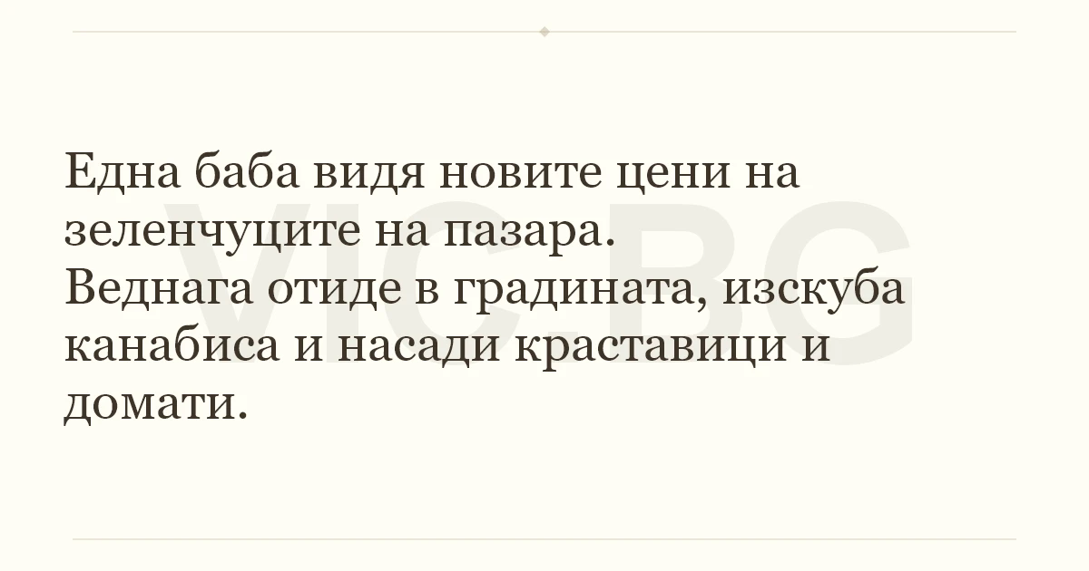 Една баба видя новите цени на зеленчуците на пазара. Веднага отиде в градината, изскуба канабиса и насади краставици и домати.