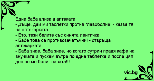 Една баба влегува во аптека и ѝ вели на аптекарката: - Ќерко, дај ми таблети против главоболка! Еве, од овие белите со сината лентичка! - Бабичке тоа се таблети за контрацепција! – Возвраќа...