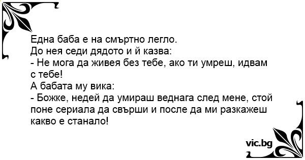 - Божке, недей да умираш веднага след мене, стой поне сериала да свърши и после да ми разкажеш какво е станало!