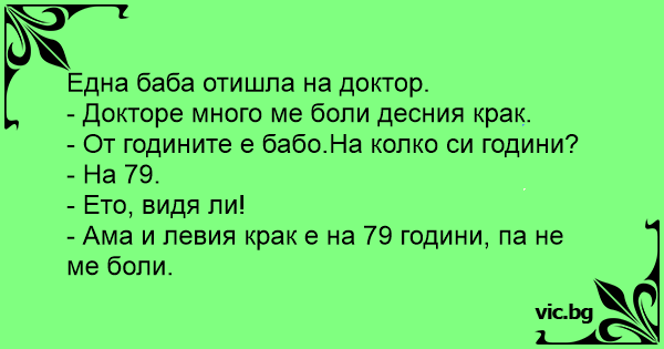 Un batran se duce la doctor Si ii spune ca il doare piciorul drept. - Nimic grav, spune doctorul. Varsta e de vina. - Nu cred. Piciorul stang are aceeasi Varsta si nu ma doare.