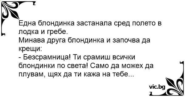 - Безсрамница! Ти срамиш всички блондинки по света! Само да можех да плувам, щях да ти кажа на тебе...