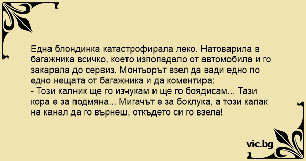 Една блондинка катастрофирала леко. Натоварила в багажника всичко, което изпопадало от автомобила и го закарала до сервиз. Монтьорът взел да вади едно по едно нещата от багажника и да коментира: