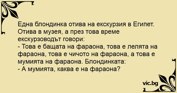 Една блондинка отива на екскурзия в Египет. Отива в музея, а през това време екскурзоводът говори: