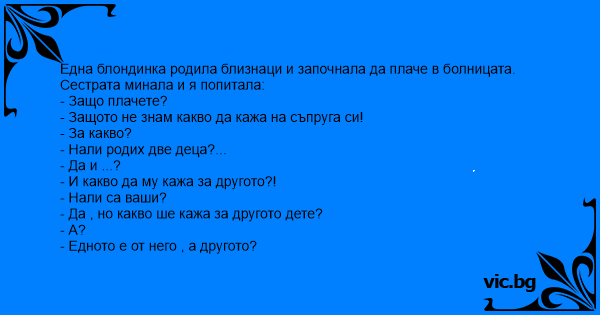 Blondīnei piedzimst dvīņi. Viņa sēž un rūgti raud. Pienāk medmāsa un prasa: Kādēļ Jūs raudat? Ko es teikšu vīram, no kā man ir otrs bērns?