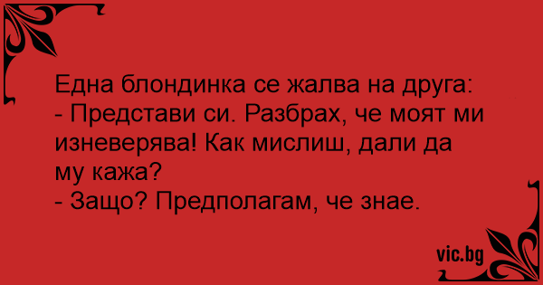 - Представи си. Разбрах, че моят ми изневерява! Как мислиш, дали да му кажа?