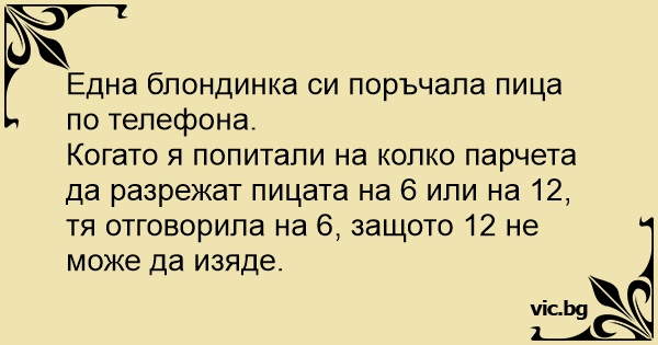 Когато я попитали на колко парчета да разрежат пицата на 6 или на 12, тя отговорила на 6, защото 12 не може да изяде.