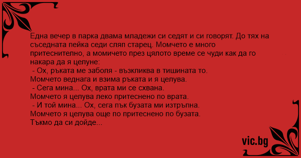 En vacker sommarkväll sitter ett kärlekspar på parkbänken. Bredvid dem på samma bänk sitter en äldre man. - Jag har ont i handen! säger tjejen. Killen kysser hennes hand, flickan fnissar och...