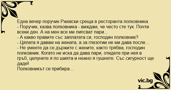 - Поручик, казва полковника - виждам, че често сте тук. Почти всеки ден. А на мен все ми липсват пари...