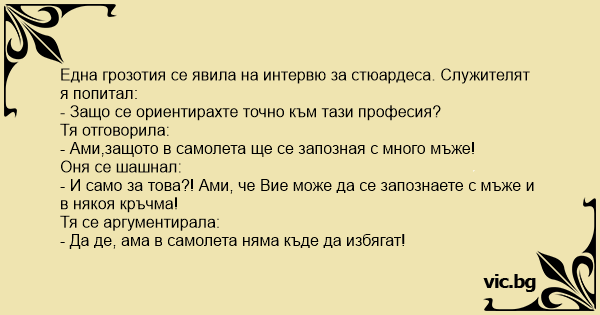 Една грозотия се явила на интервю за стюардеса. Служителят я попитал:
