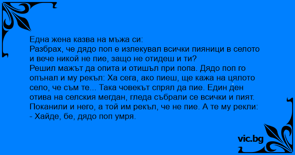 Решил мажът да опита и отишъл при попа. Дядо поп го опънал и му рекъл: Ха сега, ако пиеш, ще кажа на цялото село, че съм те... Така човекът спрял да пие. Един ден отива на селския мегдан, гледа събрали се всички и пият. Поканили и него, а той им рекъл, че не пие. А те му рекли: