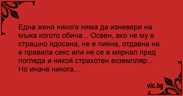 Една жена никога няма да изневери на мъжа когото обича... Освен, ако не му е страшно ядосана, не е пияна, отдавна не е правила cekc или не се е мярнал пред погледа и някой страхотен екземпляр...