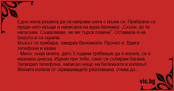 Една жена решила да си направи шега с мъжа си. Прибрала се преди него вкъщи и написала на една бележка: „Скъпи, аз те напускам. Съжалявам, не ме търси повече“. Оставила я на бюрото и се скрила.
