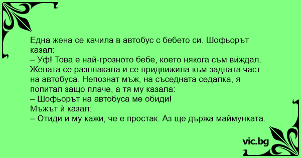 O femeie cu un copil in brate se urca in autobuz. Soferul Zice: - Aoleu, asta e cel mai urit copil pe care l-am vazut Vreodata. Femeia Se duce in spatele autobuzului si se asaza pe scaun, Spumegind...