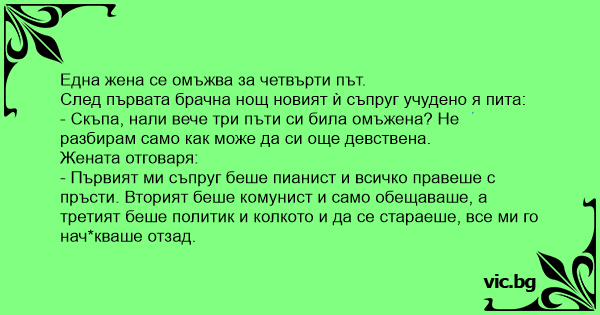 - Скъпа, нали вече три пъти си била омъжена? Не разбирам само как може да си още девствена.