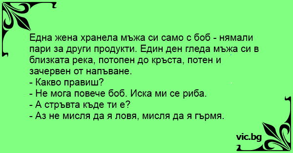 Една жена хранела мъжа си само с боб - нямали пари за други продукти. Един ден гледа мъжа си в близката река, потопен до кръста, потен и зачервен от напъване.