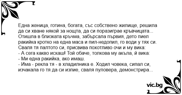 - Кажи сега какво искаш - Ами още една ракийка, ако даваш, казал човека (дотам му стигало въображението). Така продължили известно време, жената останала напълно гола и казва: