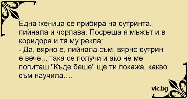Една женица се прибира на сутринта, пийнала и чорлава. Посреща я мъжът и в коридора и тя му рекла: