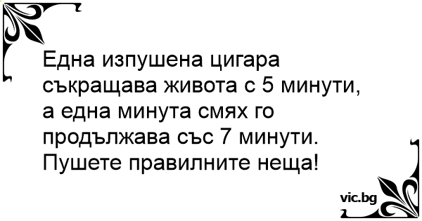 Една изпушена цигара съкращава живота с 5 минути, а една минута смях го продължава със 7 минути.