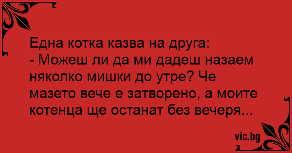 - Можеш ли да ми дадеш назаем няколко мишки до утре? Че мазето вече е затворено, а моите котенца ще останат без вечеря...