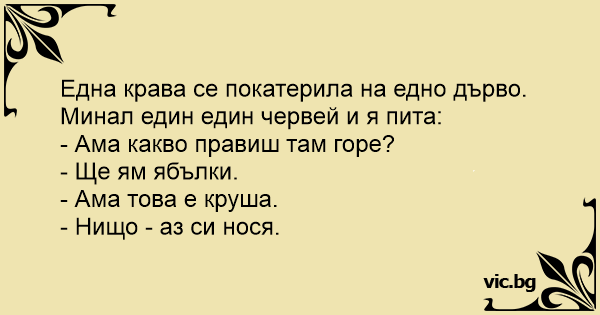 Корова лізе на дерево. Ворона їй: — Корова, ти чого це на дерево лізеш? — Яблук хочу поїсти. — Так це ж ялинка! — А у мене з собою...