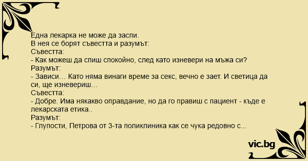 Млъкнала съвестта. Тъкмо докторицата се унася в сън, съвестта пак се обажда ехидно: