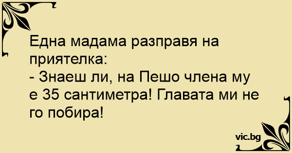 - Знаеш ли, на Пешо члeнa му е 35 сантиметра! Главата ми не го побира!